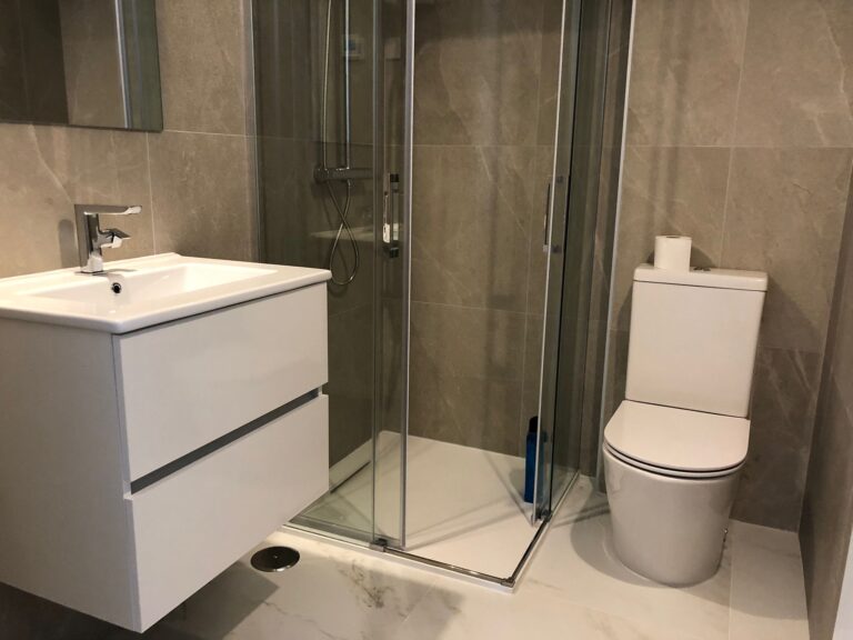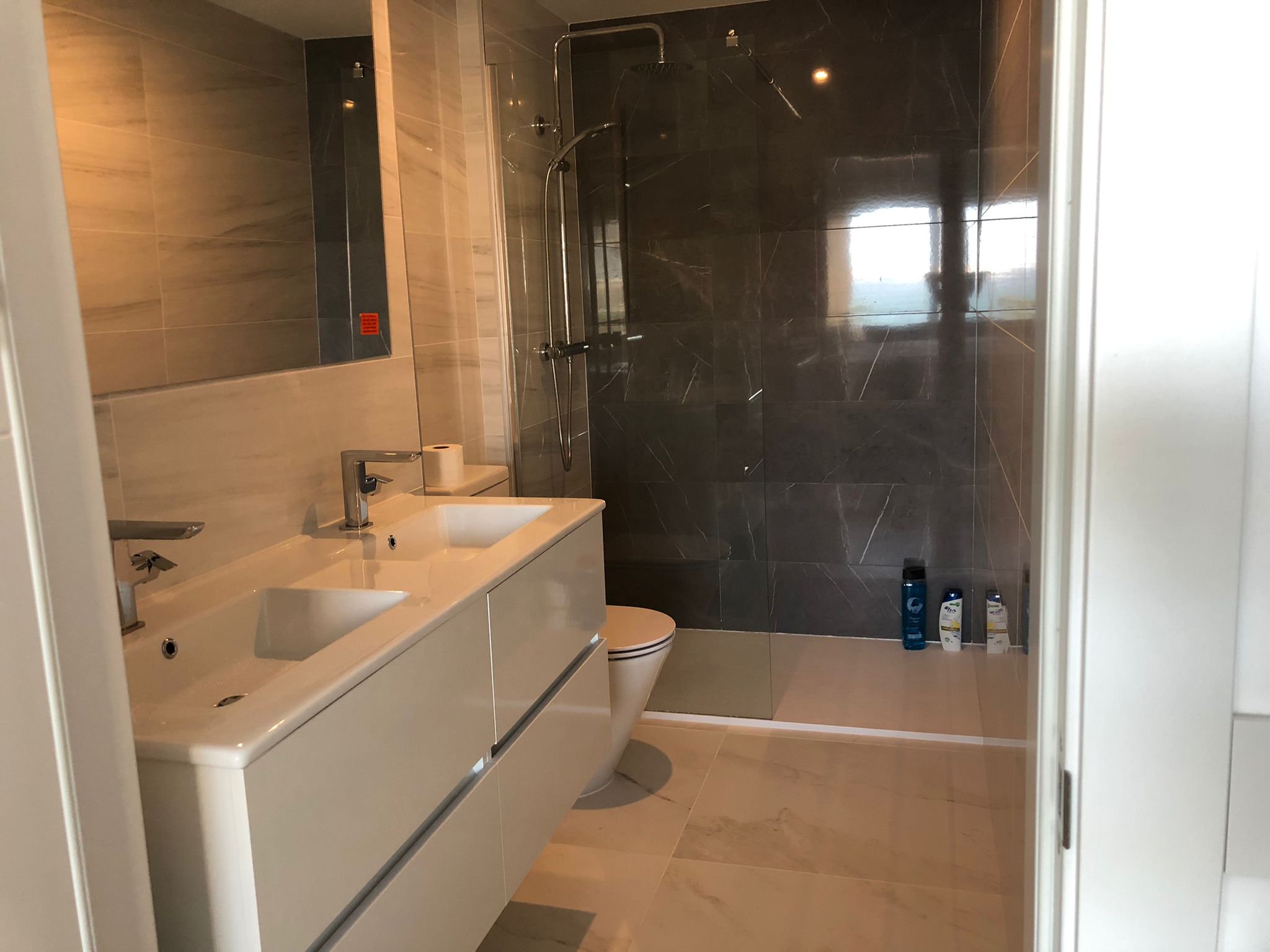 Twee luxueus uitgeruste badkamers met toilet en douche.