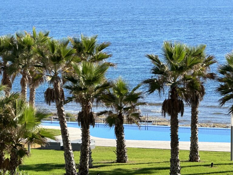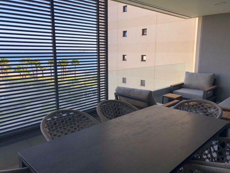 Terras van 16m² met luxe meubilair en zonnewering en fantastisch zicht op zee en de tuin van het resort.